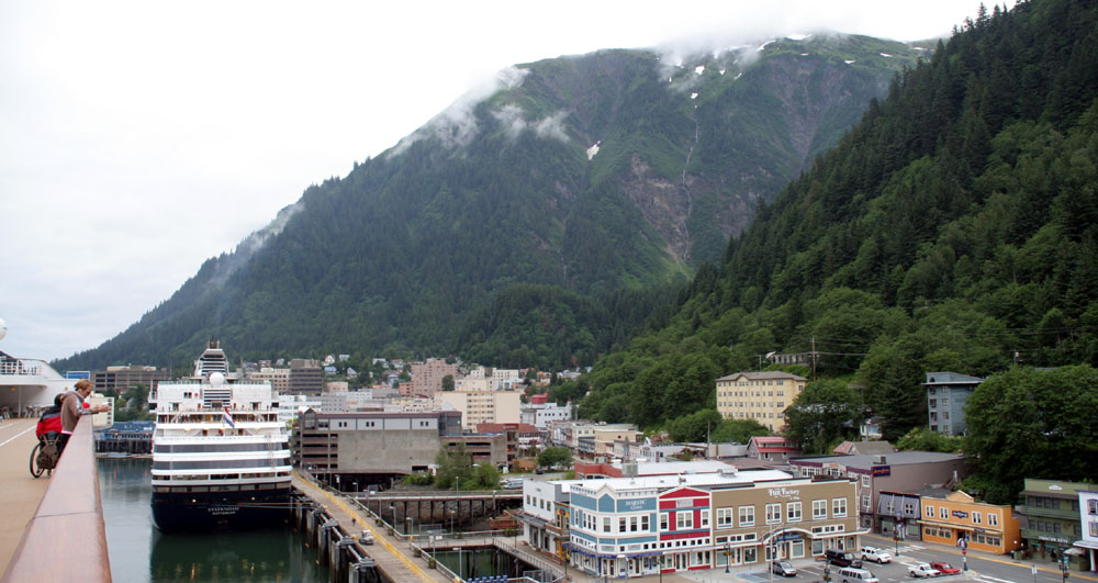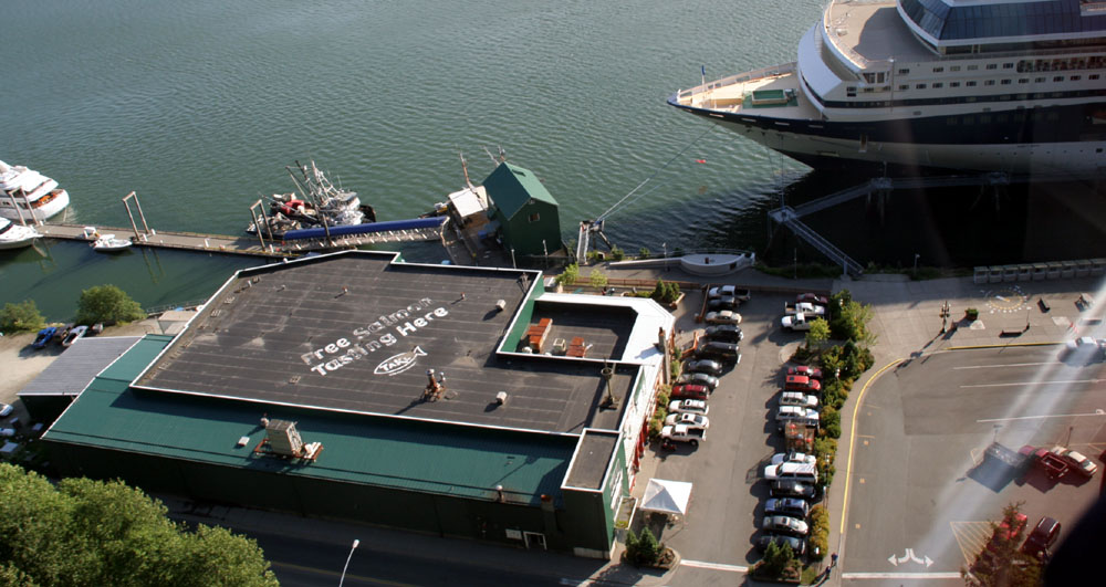 下面这组照片( 共7张 ),就是在船上,远眺 Juneau 的 Downtown 的一侧 ( 从左到右,视觉范围达到 180度 )。 远处的长方形高层建筑,是朱诺最丑陋的政府建筑,因为超预算一直为居民诟病。 ![]() 先于我们停靠在这里的 Statendam 游轮 靠港的很多建筑大多都是建在水上的。 游轮码头附近的商业区 罗伯特山缆车( Mount Roberts Tramway ) , 缆车直上500多米到达罗伯特山顶,从那里可以将朱诺市尽收眼底。 Taku Smokeries & Store 。船上提供的信息:这里可以免费的品尝三文鱼! |