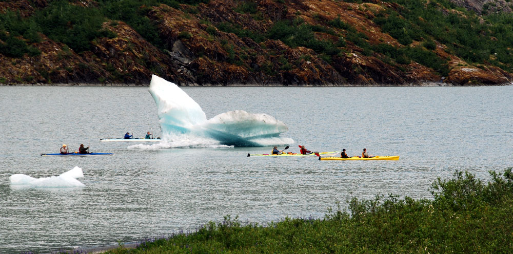 这里是一个国家公园 - 曼登豪冰川(Mandenhall Glacier)。这里和其他几十条冰川一样,曼登豪冰川也是发育于1500平方英里的朱诺冰盖。由于其1.5英里的宽度和从山上倾斜而下的势头,而成为游人必去的自然景观。和浪潮型哈巴德冰川不同,曼登豪冰川是陆地型的,远离海洋。 白色的冰川从山上蜿蜒而下,蓝色的冰舌形成一道巨大的冰墙。冰水融化的水聚成了碧蓝的曼登豪湖。湖面上漂浮着巨大的碎冰,周边的山峰和森林倒映在平静如镜的湖中。 游客中心建在冰湖边的巨大岩石上,有一道玻璃墙可供室内观景,还配备了多架高倍望远镜。中心循环放映着一部有关曼登豪冰川的纪录片。冰川50年来已经退后了好几公里,最近几年更以每年数百英尺的速度后退。中心所在的岩石几十年前还为冰川覆盖。现在可以让游人就近观察冰川千百万年来的对岩石的作用,那些长长的擦痕,半圆形的沟槽,都是冰川巨大力量的遗迹。现代冰川是最后一个冰期(约10000-6000年前)的遗迹。当时,32%的陆地面积为冰川覆盖。当前,地球陆地10%的面积仍为冰川覆盖。冰川储藏了地球上75%的淡水。如果全部冰川都融化,海平面将上升约70米,世界上大多数滨海城市包括纽约上海香港都将没入海底。 入口陈列着: 站在游客中心向下看曼登豪冰川。想想看,50年前冰川就在脚下,由于全球气候暖化,现在已经退缩到了...... |