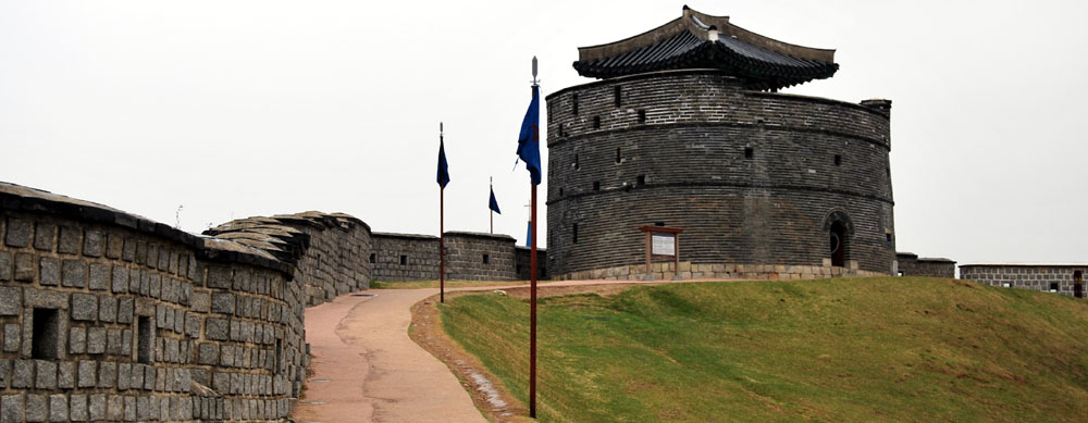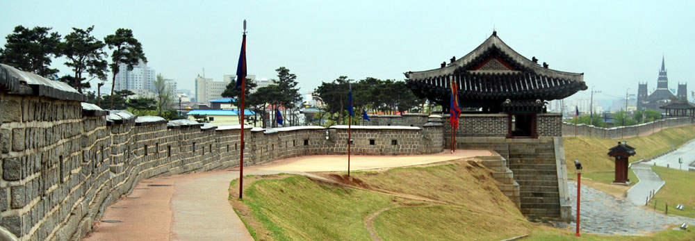 | 水原华城 是李朝(1392-1910年)后期建于京畿道水原市内的邑城。水原城的轴城于李朝第22代王正祖18年即1794年开工,1796年完工,是为了向父亲庄献世子表示孝心以及显示经济实力而建造的新城市。 水原华城城墙全长5.52公里,安装了各种在其它城内看不到的军事设施。城墙上方建造了女墙,上面有多个射击口,可以既掩护自身,又能监视和攻击敌人。东西南北四个方面都有城门,北门称长安门,南门称八达门,东门称苍龙门,西门称华西门。水原城内还有小溪流经,小溪与城墙相遇处则设置了水门,共有7 个拱形水门可供小溪流过,其上修建了名叫华虹门的楼阁。 华城建设时参考了实学家柳馨远(1622-1673年)和丁若镛(1762-1836年)的意见,并以此为设计的基本方针,被认为是韩国城墙中最科学的城墙。特别是修建城墙时同时使用了石材和砖块,其结构既能防御敌人的弓箭和长枪,也能向敌人开枪发炮,可谓十分优秀。此外丁若镛发明的起重机使用了多个滑轮,能经很小的力气拉动沉重的石头,大大提高了工程的效率。 水原华城在长久的岁月中城墙多处损伤,朝鲜战争时更有许多设施遭到破坏,1975年至1979年又重新恢复原样。但是从八达门到东南角楼的491米却未能恢复。水原华城于1963年1月被指定为第3号史迹,1997年12月与昌德宫一起注册为联合国教科文组织认定的世界文化遗产。 ![]() |
