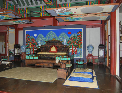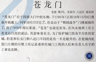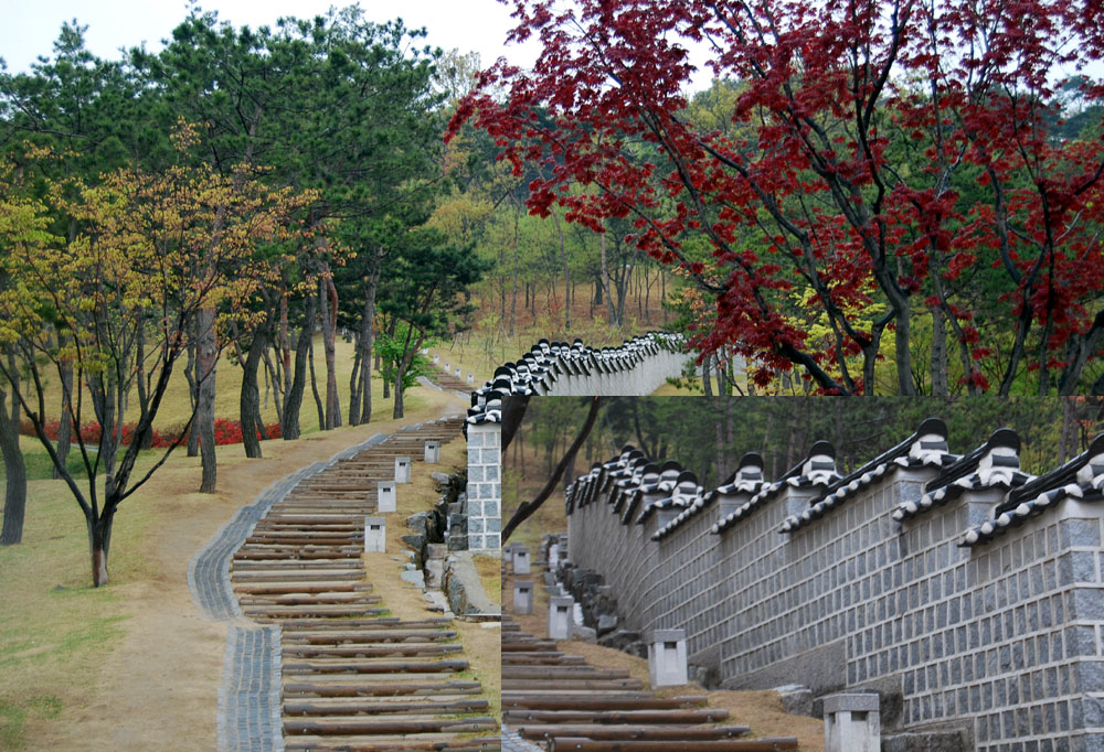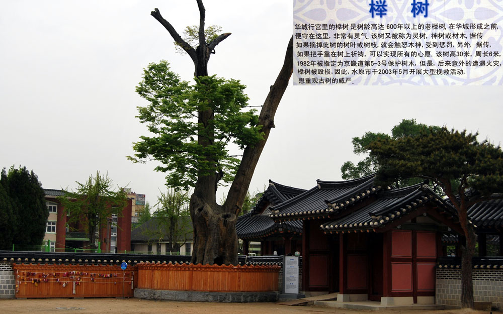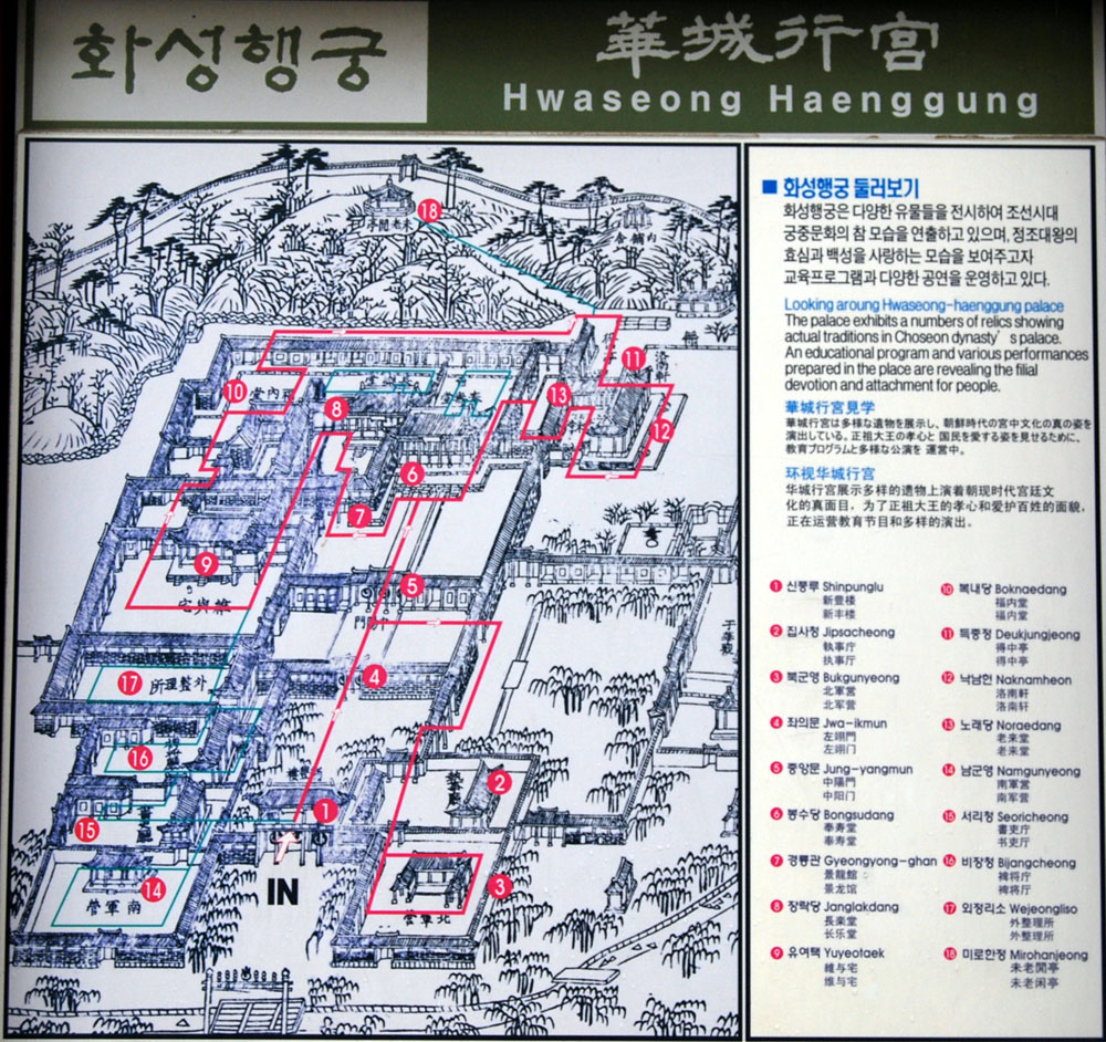 华城有四个大门。南门是八达门。把砖头堆成半圆形壅城,石墙砌成彩虹门,2楼上建筑楼台。北门是长安门。两边有华西门和苍龙门。四个大门用坚固的城墙连接。设置有将台、敌台、炮楼、铺楼、空心墩、椎城、角楼、弩台、暗门等。八达山上有将军骑马的雕像。北东敌台有一架古炮。西三椎旁边立有世界文化遗产字样的巨石。西将台、西弩台,是在八达山顶上刺探城周围情况、指挥军队的指挥部,是整个华城的最高点,可以看到周围100里。 到水原华城南门八达门,往东上东南角楼,经过烽墩和东炮楼,东门是苍龙门。旁边有练武台。东北角楼访花随柳亭春天时景色很美。华虹门为石桥,设有7个霓虹水门,水原川贯穿华城南北。再到长安门、北西炮楼、西将台。往下走到将军铜像,再到大乘阮佛像和寺庙,然后到华城行宫。 华城行宫在八达山下。正门是新丰楼,楼前的广场每周六有常设表演。开始是木偶剧表演,有韩语解说;接着有穿着艳丽韩国传统服装的女演员表演,令人赏心悦目。从新丰楼正门进去,走过左诩门、中阳门,到奉寿堂,这是华城行宫的正殿。左边的长乐堂是惠庆宫的寝宫,正祖写了匾额。景龙宫象征着帝王是一种大型的龙。福内堂是留守家人居住的地方。电视连续剧《大长今》的许多场景就是在这里拍摄的。右边的老来堂是正祖辞退王位而后建的。洛南轩是1795年举行科举考试和花甲宴、养老宴等活动的地方。维与宅是正祖巡查时停留并接见臣子的地方。外整理所主要负责国王巡查时做好典礼准备。还有裨将厅、书吏厅、执事厅、北军营、南军营等。另有於华馆、藏春阁、别厨等未修复。这些建筑很有特色,也能看到中国古代建筑样式的影响。院子里还展示了著名实学家丁若镛设计的起重机,也借鉴了中国的工具样式。 |