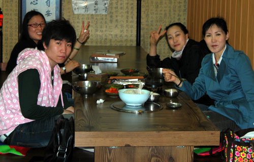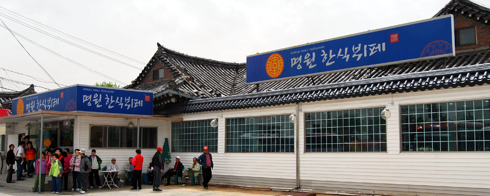 午饭的时间,来到了一个外表很一般的餐馆,招牌上写着:Korean Family Restaurant ( 同行的大哥还玩笑地说:给我们准备的是“农家饭”吧!)。门口竟然有人在等着吃饭? ![]() 这是一家韩式的自助餐厅,品种很多,味道也相当不错。价格为:7000韩币/每位。一顿不错的午餐! |