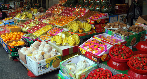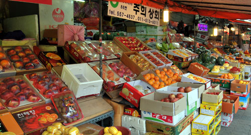 ![]() ![]() 餐馆的旁边有好多水果摊。新鲜、漂亮非常诱人。 往里面走进去,原来是个水果批发市场。 拍卖声音很响,就是听不懂(韩语)! ![]() |