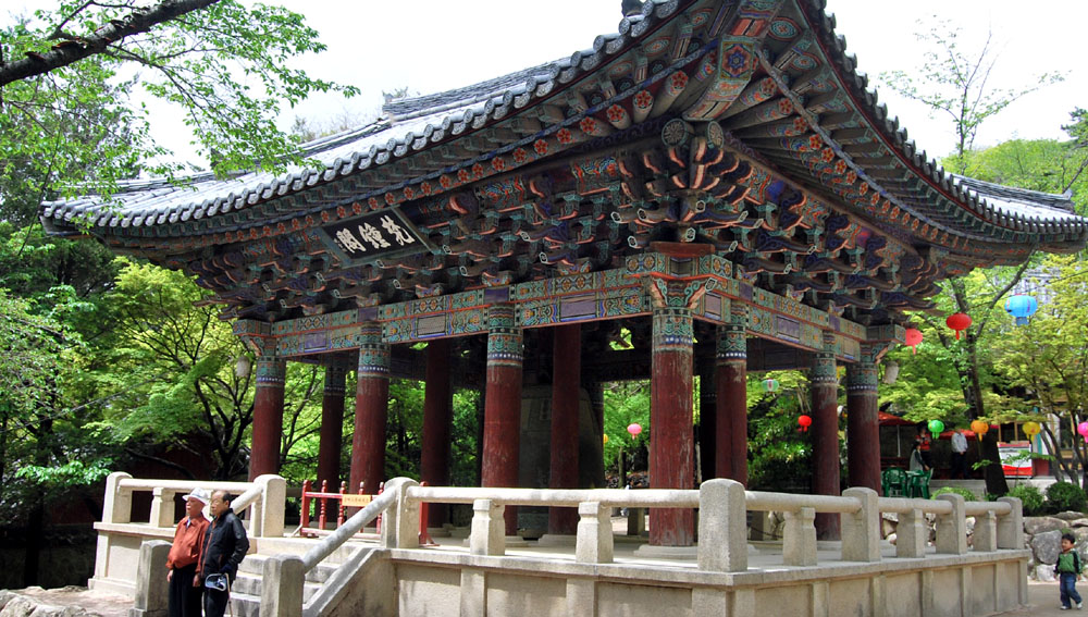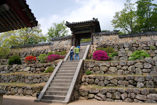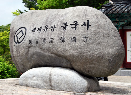 佛国寺 佛国寺坐落在韩国庆尚北道东南的吐含山山腰处,离庆州约 10 公里,是韩国著名的古迹之一,于 1995 年 12 月被列为世界文化遗产。佛国寺创建于新罗法兴王二十二年(公元 535 年),公元 751 年新罗景德王时期国相金大成重建,但壬辰之乱时全寺大部分建筑物被烧毁,只有当时的石造建筑物得获保全,如三层石塔和多宝塔等各种建筑物的基座和紫霞门、安养门前的大型高台以及可以拾级而上的石桥形石砌台阶大都是公元750 年前后建造的。寺庙中所有木结构建筑物都是后世复原重建之物。现存的寺院规模只有原来的十分之一。在佛国寺的入口处有一片葱郁茂密的树林,掩映在绿叶之中的山门上书有“吐含山佛国寺”6 个金光闪闪的大字。门内并排建有两座很高的双层石坛,向着石坛架有几座石桥。一面是青龙桥、白云桥,一面是莲华桥、七宝桥。桥下以前曾建有九品莲池,后遭毁坏。从七宝桥往上可到达紫霞门,门内有大雄殿。殿的两侧各有一塔,西塔俗称释迦塔,高 8.2 米,是新罗的典型石塔,外形质朴,匀称美丽;东塔称多宝塔,高 10.4 米,是建在双层基座上的三层石塔,为新罗石造美术的代表作品。在极乐殿内供奉着金铜毗卢遮那佛和阿弥陀佛,都是新罗统一时代铸造的珍贵文物。佛国寺属伽蓝布局形式,其特点一是以大雄殿为中心,紫霞门、无说殿左右的回廊环绕的院落和以极乐殿为中心,从安养门左右至极乐殿后的回廊环绕的院落东西并列;另一个是释迦塔和多宝塔双塔式伽蓝的双塔形式。此外,金堂大雄殿的基座、无说殿和极乐殿的基座也属伽蓝建筑物基座形式。佛国寺的石造古迹都是用花岗岩建造,其形态、建筑方法均为当时土木建筑技术之精髓,华丽宏伟,表现出一种平衡和谐之美,是韩国石造艺术的宝库。佛国寺被誉为韩国最精美的佛寺,是迄今香火始终不断的为数不多的寺刹之一。 |