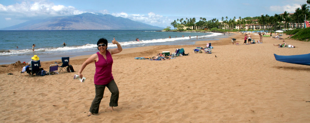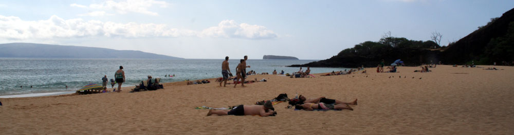 。其中 Big Beach 就是 Maui 岛上,尚未人工开发的最大的天然 white sand beach ( 我看明明是浅黄沙滩的了,不知道是怎么定义的了。)![]() ![]() ![]() 尽管还没有找到可以看鱼的地方,可是 BFC 还是按捺不住,急急忙忙的要下水了! 在这里可以看到 Molokini 。 ![]() |