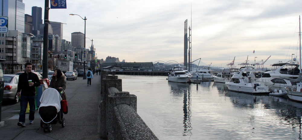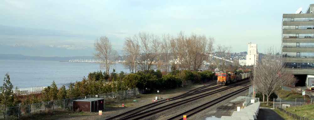 | 离开了西雅图中心,我们向水边的方向进发。这里码头比邻,铁路横穿。 |