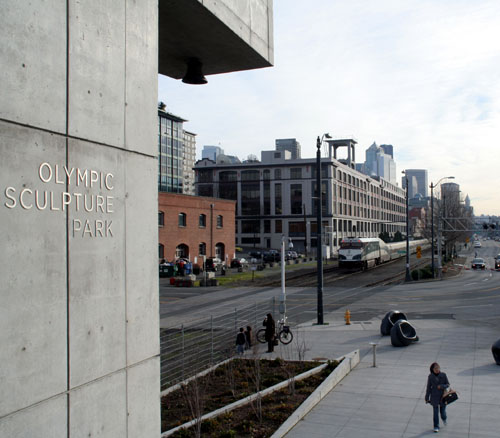 看似 一个 居民 公寓。 这是 Olympic Sculptuer Park 中 的一个作品。 从 Alaskan Way 的一端 ( Olympic Sculptuer Park ), 向 DownTown 方向远眺。 |