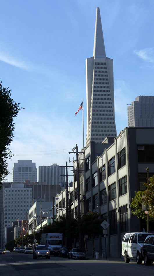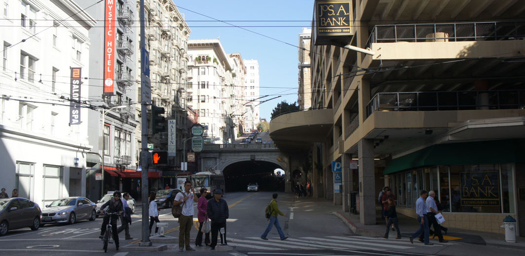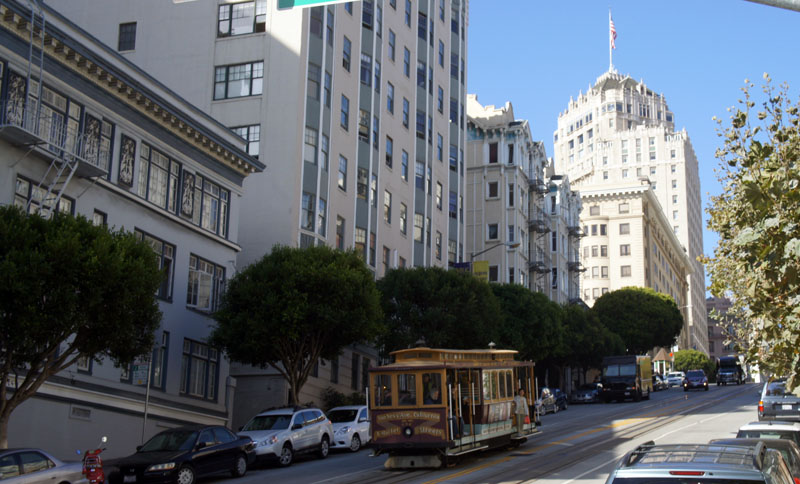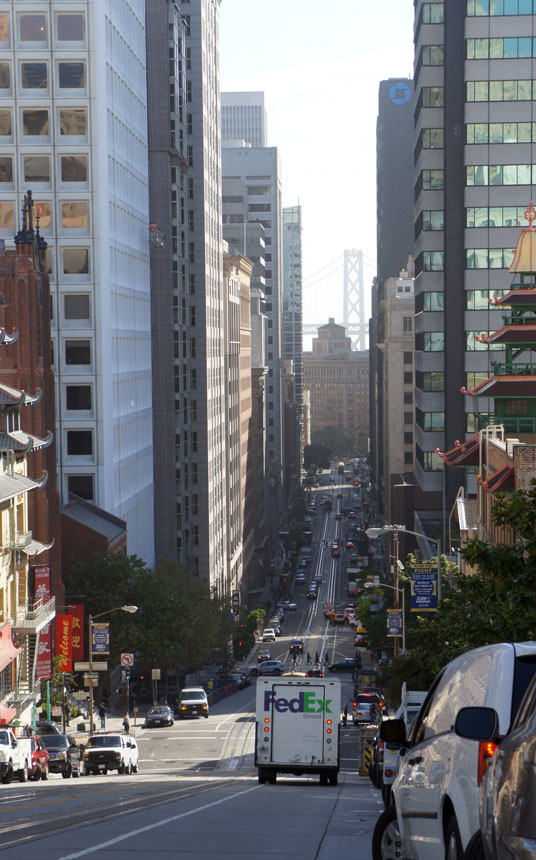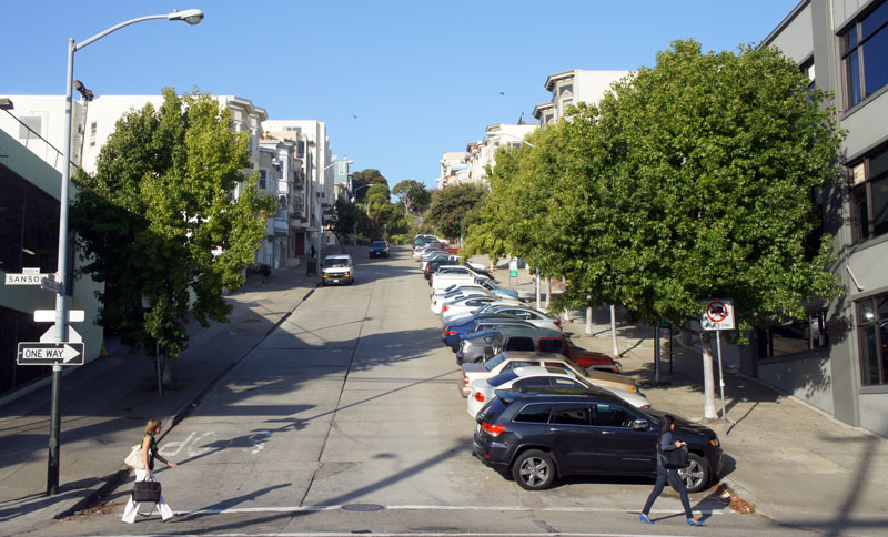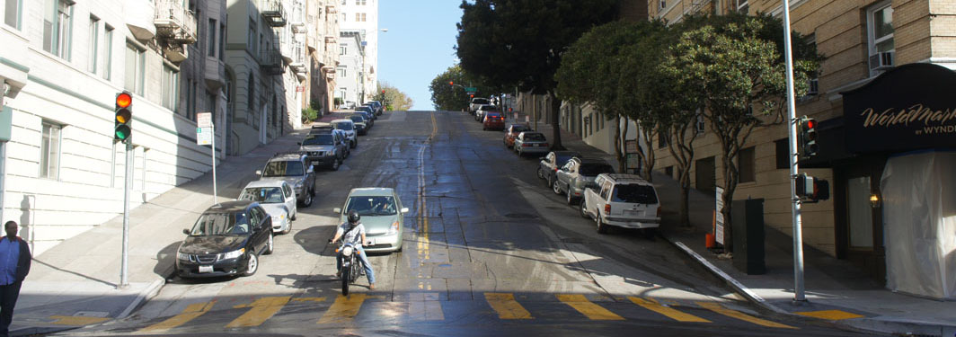 | 旧金山的很多道路的坡度是很陡的,parking 的车辆都是“歪着肩膀”。 |