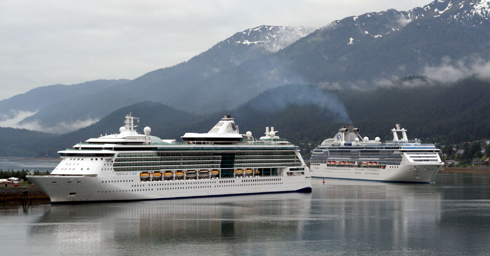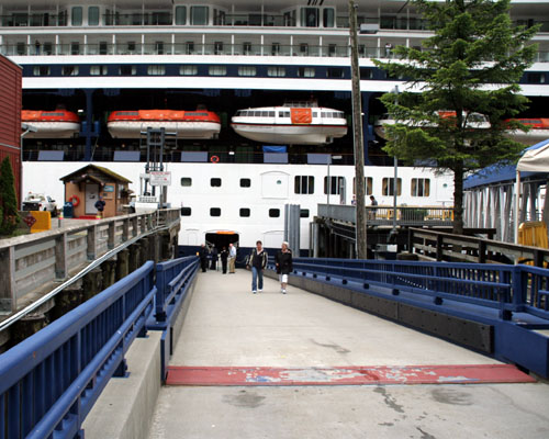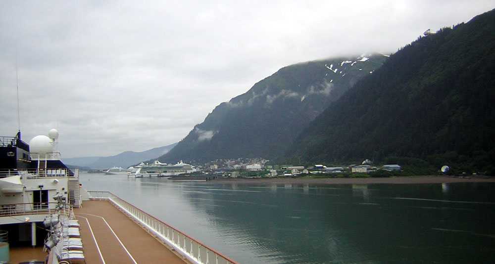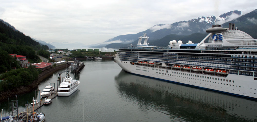 | 依山傍海,风景引人赞叹,茂密的阿拉斯加雨林苍翠得令人找不到赞叹的用词。 7:00am 船在靠岸。 另一艘游轮“珊瑚公主”号( Coral Princess )也在准备停靠。 |