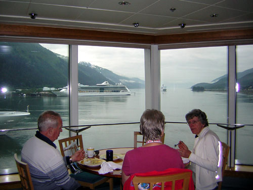 | 从冰川回来,回到船上,去吃午饭。 这两层窗户,就是我们吃晚饭的主餐厅。 |