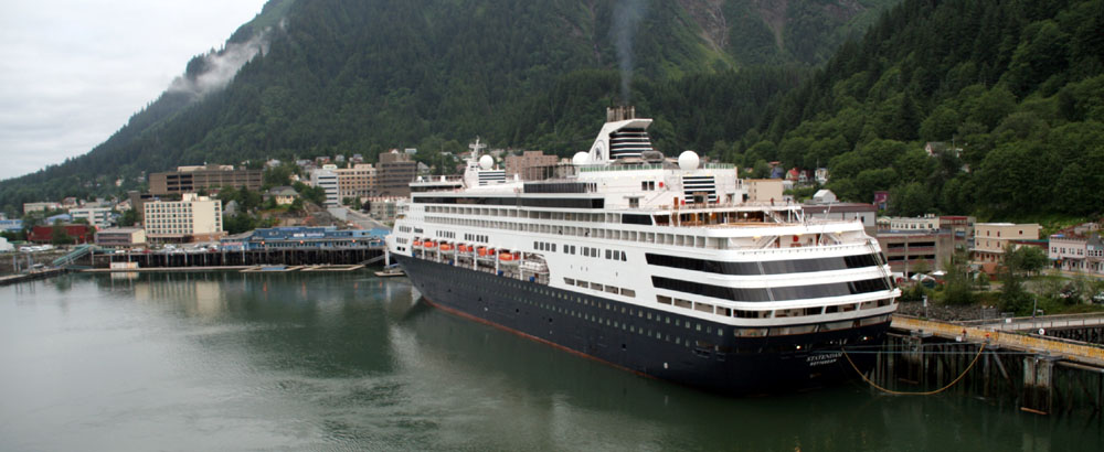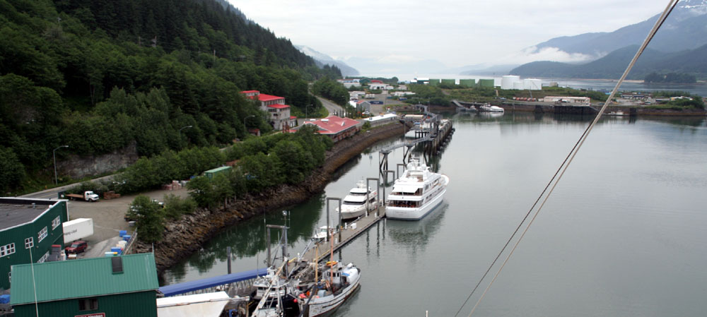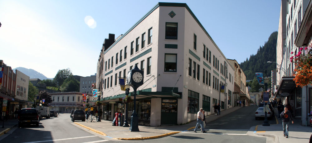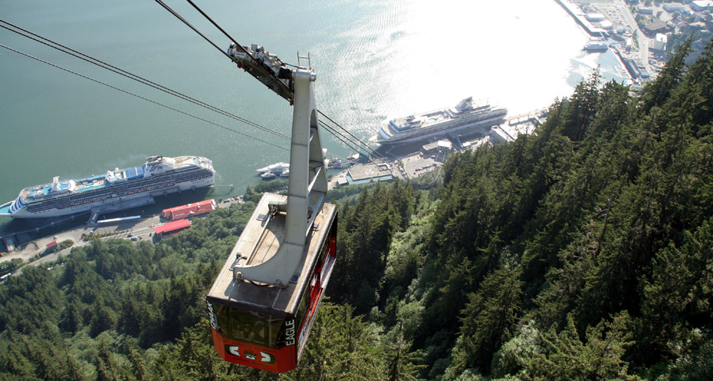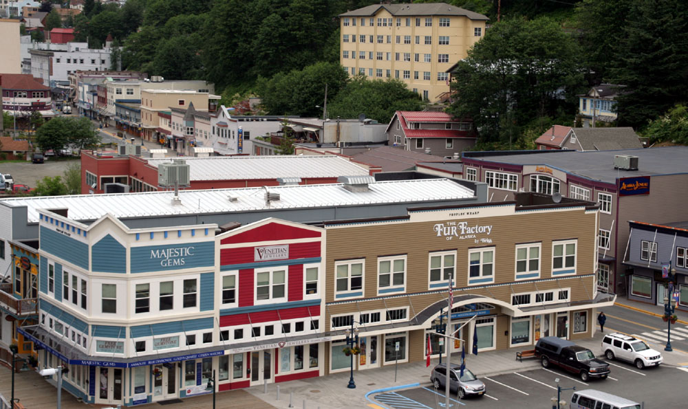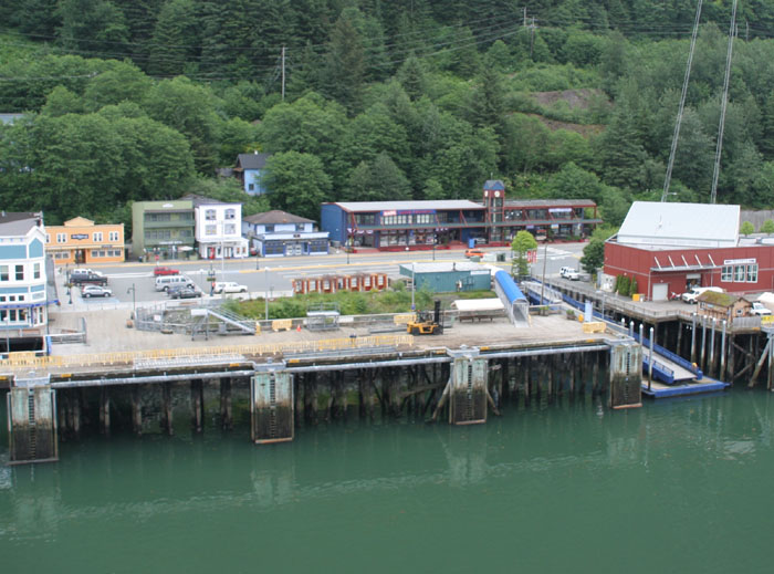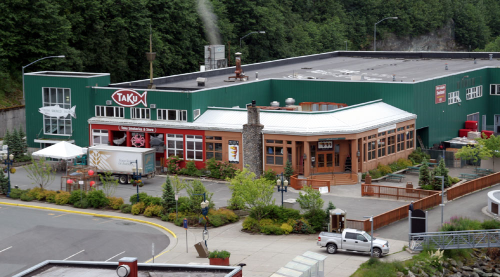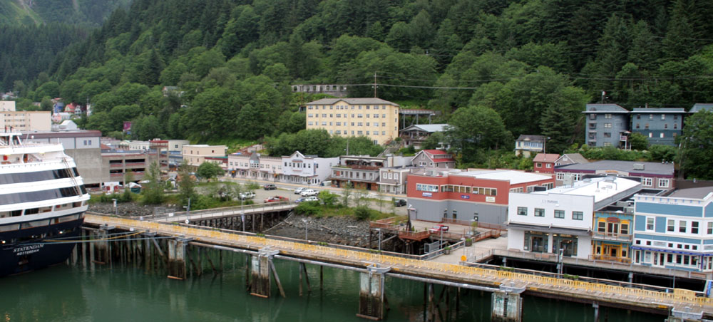 下面这组照片( 共7张 ),就是在船上,远眺 Juneau 的 Downtown 的一侧 ( 从左到右,视觉范围达到 180度 )。 远处的长方形高层建筑,是朱诺最丑陋的政府建筑,因为超预算一直为居民诟病。 ![]() 先于我们停靠在这里的 Statendam 游轮 靠港的很多建筑大多都是建在水上的。 游轮码头附近的商业区 罗伯特山缆车( Mount Roberts Tramway ) , 缆车直上500多米到达罗伯特山顶,从那里可以将朱诺市尽收眼底。 Taku Smokeries & Store 。船上提供的信息:这里可以免费的品尝三文鱼! |