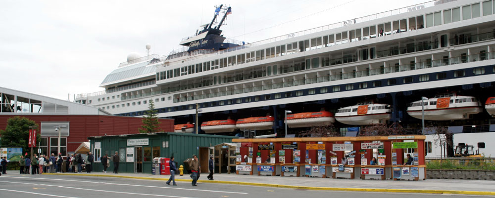 这些摊位都是卖旅游车票,水上飞机和钓鱼船票的。 绿色的小房子是 Visitor Information, 收集了一些地图和资料,又返回到船上。 |