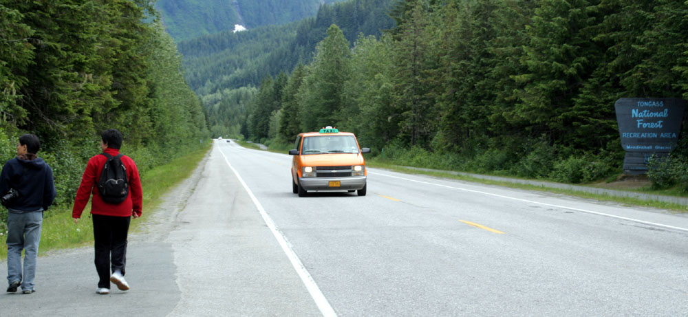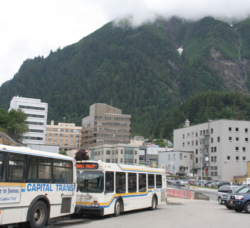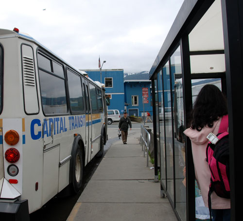 | 吃早饭的时间,“行动小组”决定乘公车去朱诺第一名胜,著名的曼登豪冰川(Mandenhall Glacier)。 要乘坐的 4路 BUS, 就在这里。很近,5分钟就从大船走到了这里。 车资:$1.5 。 |