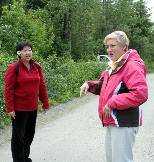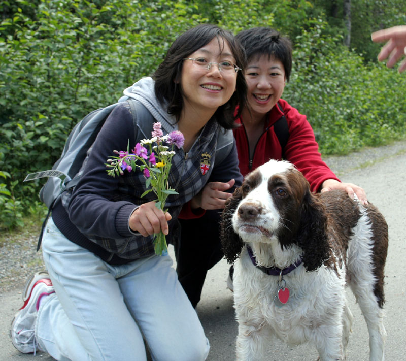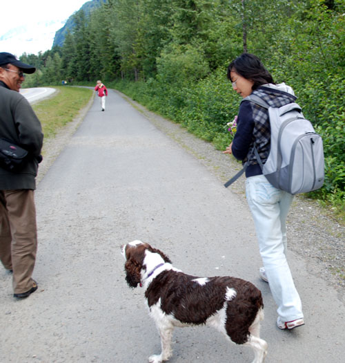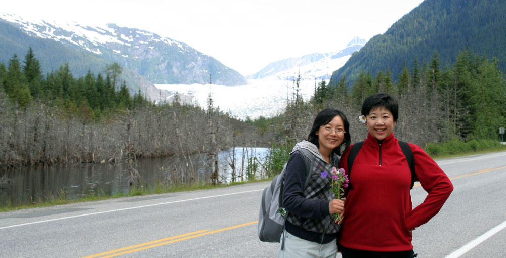 | 下车后,要走 1.6 Miles 的路, 路边一家 House 。 已经看到远处的冰川了,迫不及待人,采了路边的野花,要来“秀一秀”。 突然,来了一位不速之客。 交谈中得知:她的主人是这里旅游业的工作人员,热情地介绍了很多信息。 ![]() 三个 Girls 来个合影。 |