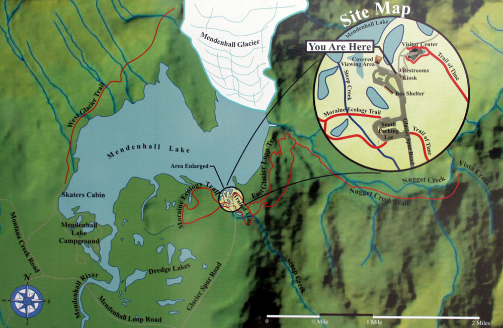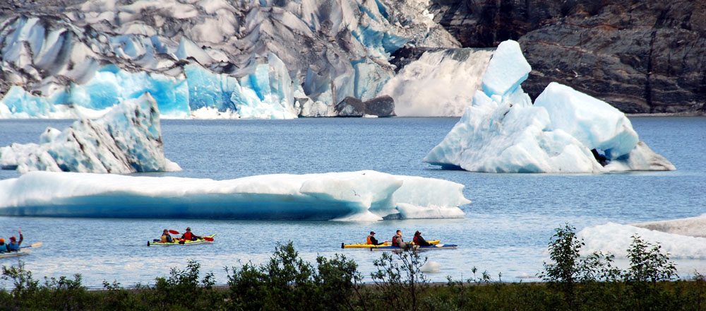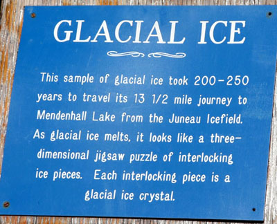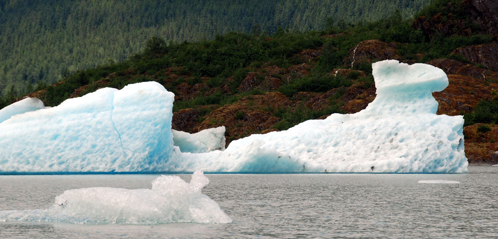 这里是一个国家公园 - 曼登豪冰川(Mandenhall Glacier)。这里和其他几十条冰川一样,曼登豪冰川也是发育于1500平方英里的朱诺冰盖。由于其1.5英里的宽度和从山上倾斜而下的势头,而成为游人必去的自然景观。和浪潮型哈巴德冰川不同,曼登豪冰川是陆地型的,远离海洋。 白色的冰川从山上蜿蜒而下,蓝色的冰舌形成一道巨大的冰墙。冰水融化的水聚成了碧蓝的曼登豪湖。湖面上漂浮着巨大的碎冰,周边的山峰和森林倒映在平静如镜的湖中。 游客中心建在冰湖边的巨大岩石上,有一道玻璃墙可供室内观景,还配备了多架高倍望远镜。中心循环放映着一部有关曼登豪冰川的纪录片。冰川50年来已经退后了好几公里,最近几年更以每年数百英尺的速度后退。中心所在的岩石几十年前还为冰川覆盖。现在可以让游人就近观察冰川千百万年来的对岩石的作用,那些长长的擦痕,半圆形的沟槽,都是冰川巨大力量的遗迹。现代冰川是最后一个冰期(约10000-6000年前)的遗迹。当时,32%的陆地面积为冰川覆盖。当前,地球陆地10%的面积仍为冰川覆盖。冰川储藏了地球上75%的淡水。如果全部冰川都融化,海平面将上升约70米,世界上大多数滨海城市包括纽约上海香港都将没入海底。 入口陈列着: 站在游客中心向下看曼登豪冰川。想想看,50年前冰川就在脚下,由于全球气候暖化,现在已经退缩到了...... |