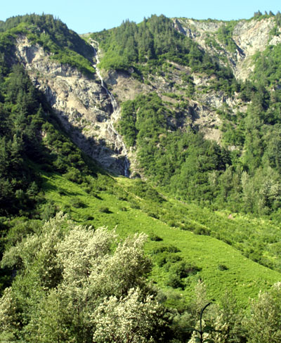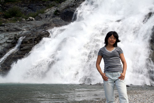 | 冰川附近的一个冰水瀑布。瀑布喧嚣着从天而降,声震冲天。摸摸水温,会让你真正地感到“冰凉刺骨”是什么滋味。 你要“秀”的是:清凉夏天; 俺老猫要做的是:故伎重演 - 双手托冰川(比上次托船多用了一支手哟! |
