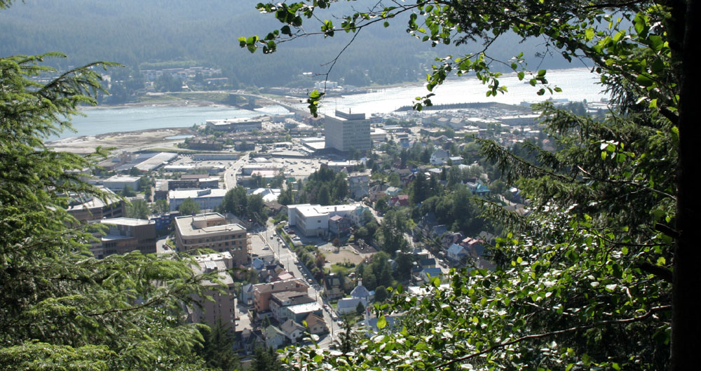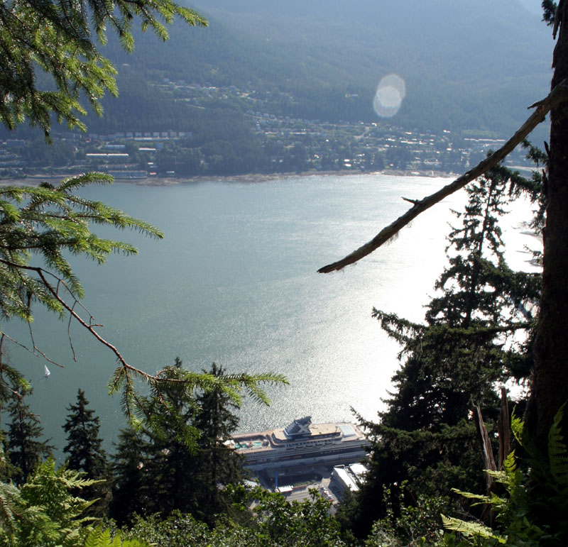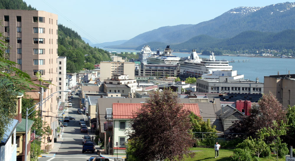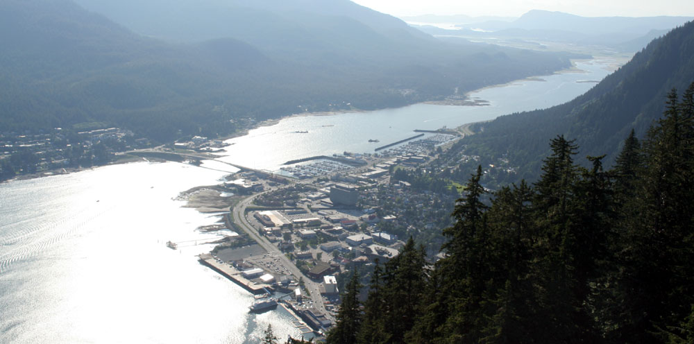 | 上图: 我们的游轮就是顺着这条“内湾航道”,来到了 Juneau 。 下图: 俯瞰全市,遗憾的是太阳已经西斜了,照片的光线不理想。 |